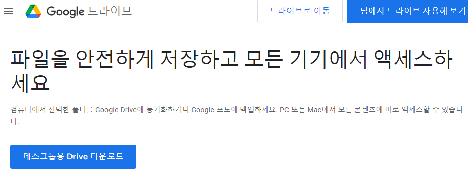 홈페이지에 먼저 들어가신 후 데스크톱 용드라이브 다운로드를 클릭하면 구글드라이브 셋업 파일을 설치 합니다.