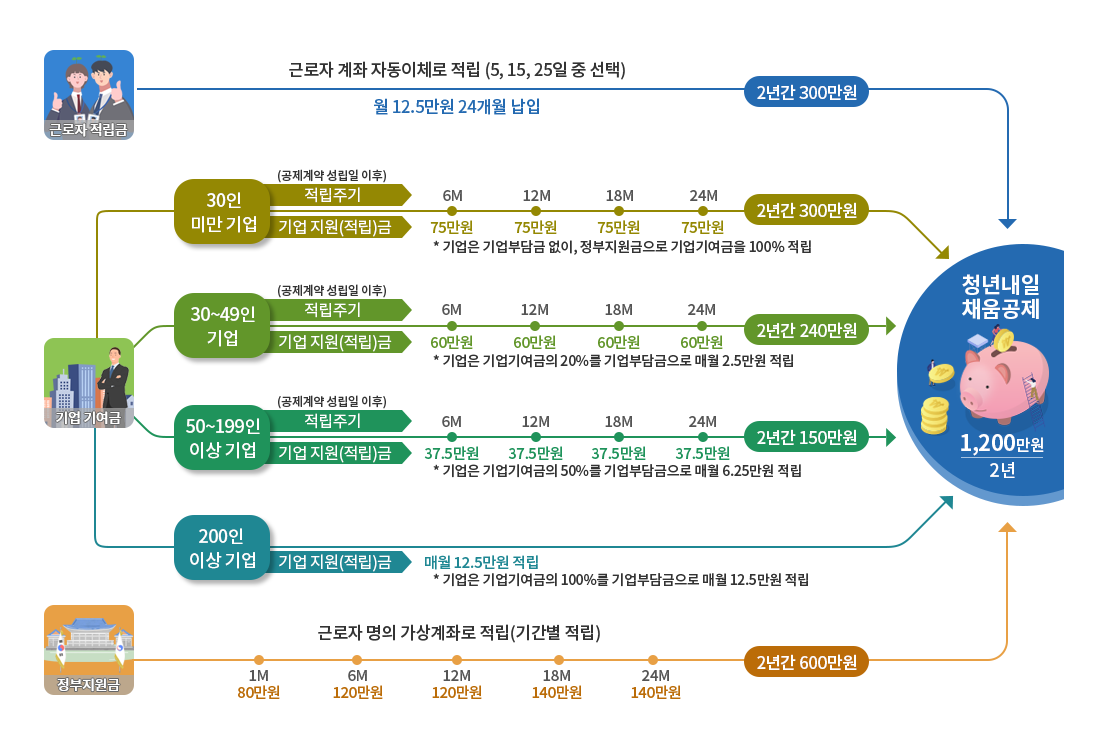 청년과 기업 및 정부가 같이 적립하여 2년간 적립하여 청년은 2년 동안 매월 12,5000원씩 2년간 적립