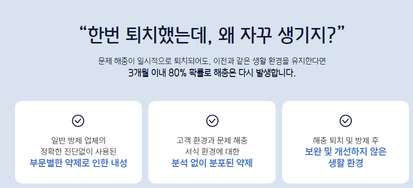 저는 세스코 추천합니다. 원래는 무료진단만 받아보려다가 실제로 해보니 정말 좋더군요.