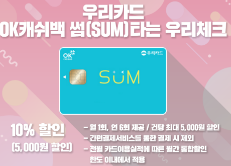 우리 카드 OK캐시백 썸 타는 우리 체크카드는 응시료의 10% 건당 5천 원 한도 내에서 할인해주며 이 카드 또한 간편 결제 서비스를 통한 결제 시 혜택은 제외되니 유의하여 사용하시길 바라겠습니다.
